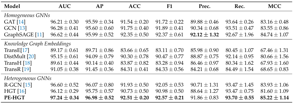 To validate the effectiveness of the proposed PE-HGT framework, we conduct a rigorous comparative study against the established baselines. All models are trained and tested on identical data splits, with experiments repeated five times to ensure statistical reliability.